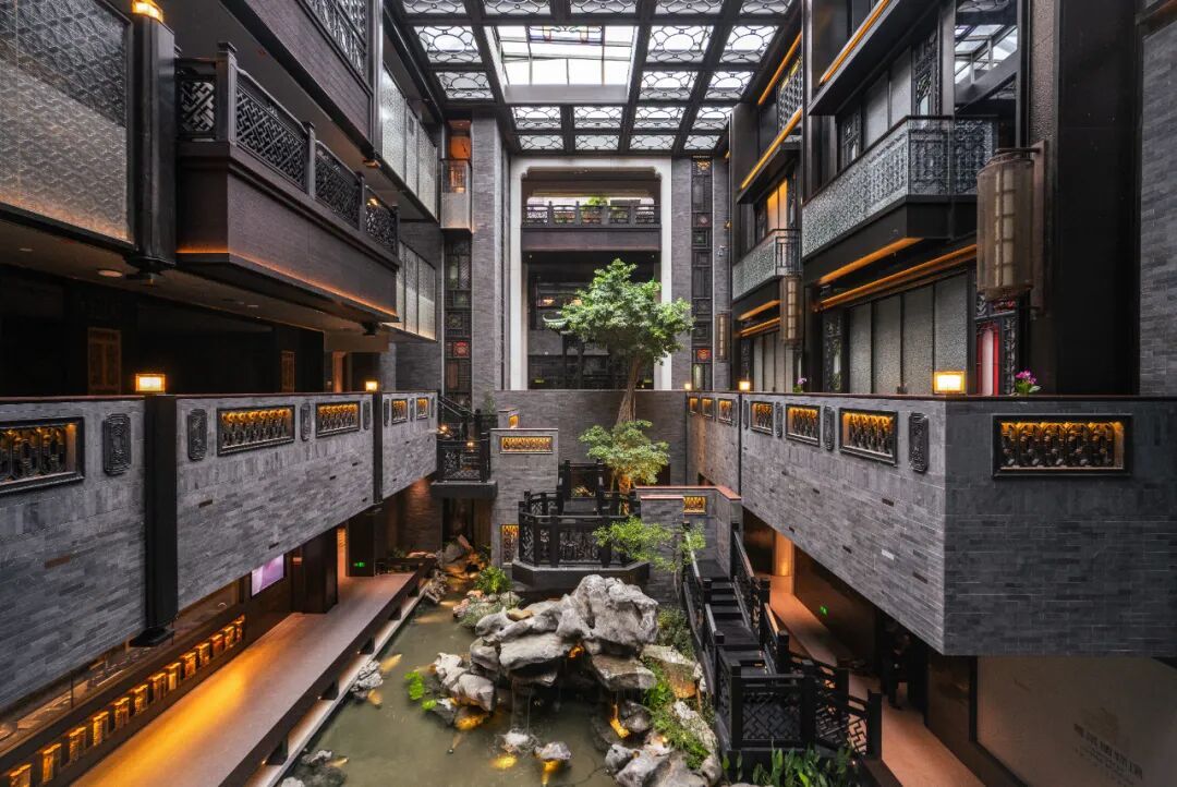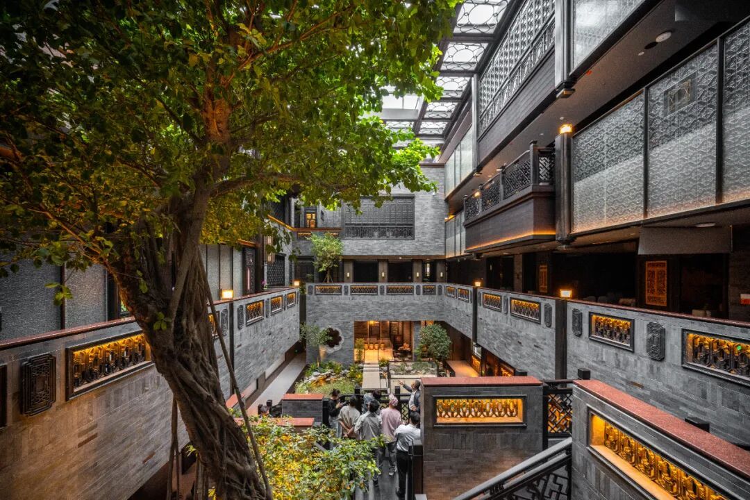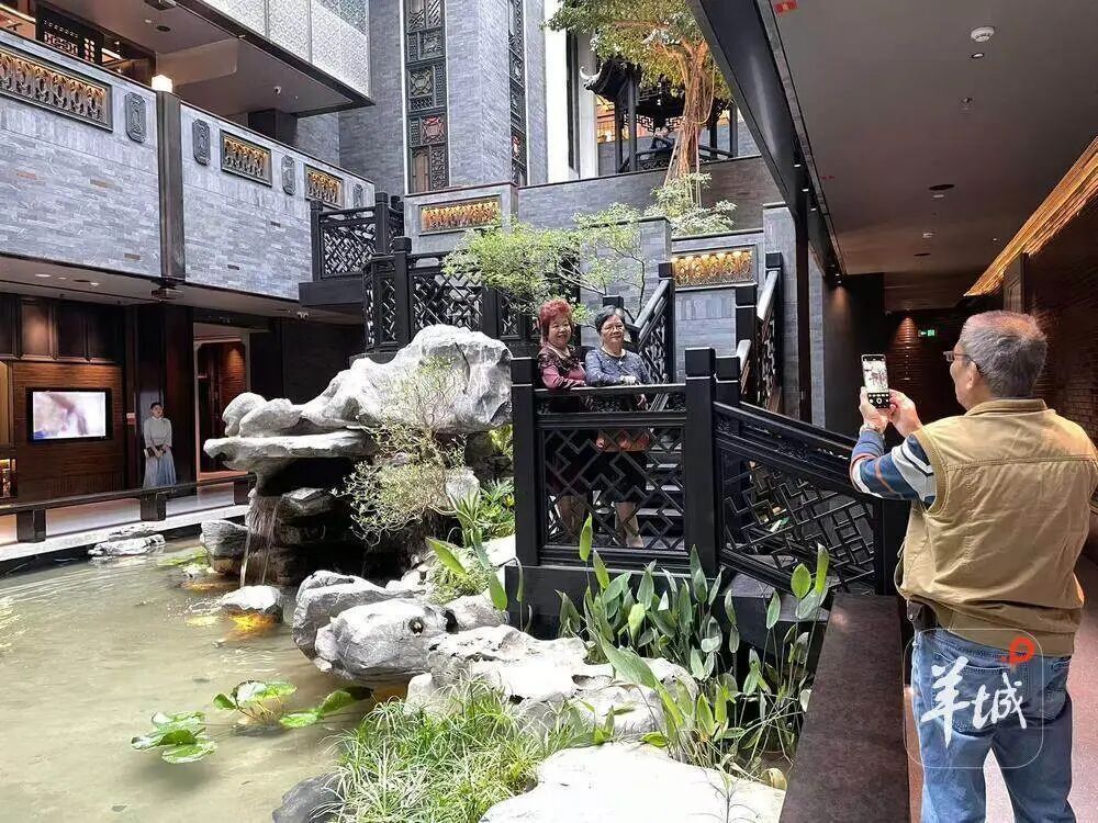 现场可见,焕新后的文昌总店保留了标志性的榕树,还打造了凉亭小景,鱼池流水潺潺,建筑装潢整体风格呈现岭南园林特色。